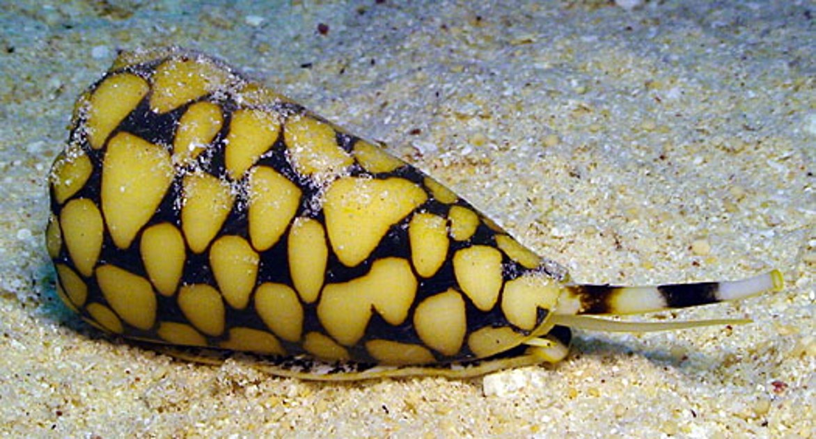 حلزون مخروطی یا Cone snail یک شکارچی دریایی است که ماهی، کرم و نرم تنان دیگر را با سیستم زهرآگین خود شکار می کند. حدود 800 گونه حلزون مخروطی یک گنجینه قوی از پپتیدهای سمی غنی از سیستئین به نام کونوتوکسین conotoxin و با تعداد کمتری کونوپپتیدهای فقیر در سیستئین دارند که در هدف گیری شکار و همچنین رسبتورهای پستانداران با تمایل و اختصاصیت بالا عمل می کنند. کونوتوکسین ها با وزن کمتر از 5 کیلو دالتون و اندازه کوچک 40-12، کانال های یونی، رسبتورها و انتقال دهنده ها در سیستم عصبی را هدف می گیرند. هر گونه حلزون مخروطی، زهر منحصر به فرد خود را با بیش از 1000 ت...